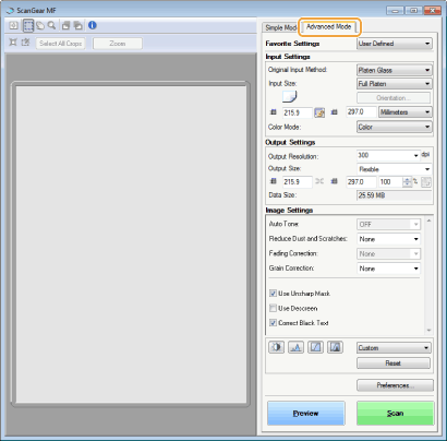 Ha a ScanGear MF képernyőn az [Advanced Mode] (Bővített mód) lehetőségre kattint, akkor az Egyszerű módhoz képest több speciális képminőségi beállítást végezhet. A módosított beállításokat Kedvenc beállítások néven tárolhatja. További részletes információkért kattintson a témakör melletti