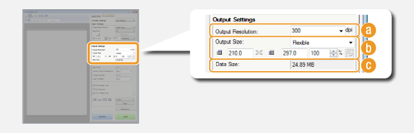 A képnek a beállított [Output Resolution] (Kimeneti felbontás) és [Output Size] (Kimeneti méret) értékekkel való beolvasása esetén megjeleníti a kép adatméretét.