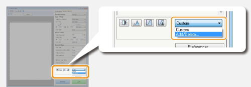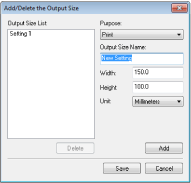 Az [Add/Delete] (Hozzáadás/törlés) lehetőséget választva új kimeneti méretbeállításokat adhat meg és törölheti a megadott méreteket.