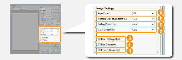 Beállítások a képminőség javításához, mint például a fényképek karcainak vagy kifakult színeinek kijavítása. Ezek a beállítások csak akkor érhetők el, ha a [Color Mode] (Színmód) beállításnál a [Color] (Színes) vagy a [Grayscale] (Szürkeárnyalatos) értéket választotta (