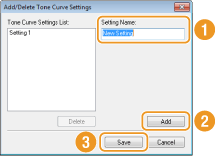 Megjelenik az [Add/Delete Tone Curve Settings] (Tónusgörbe beállításainak hozzáadása/törlése) vagy az [Add/Delete Threshold Settings] (Küszöbérték-beállítások hozzáadása/törlése) képernyő.