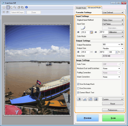 Ha a dokumentumot az üveglapra helyezi, és a [Preview] (Előnézet) pontra kattint, akkor megjelenik egy előnézeti kép. Az előnézeti képen meghatározhatja a beolvasni kívánt területet és ellenőrizheti a képbeállítások hatásait.