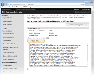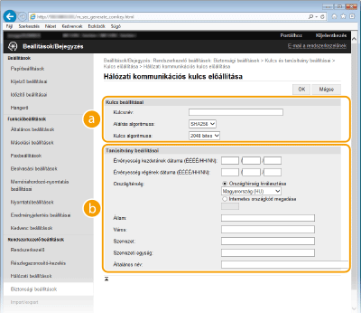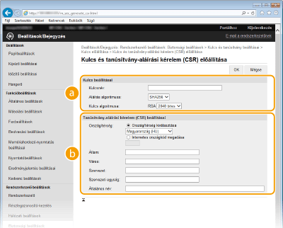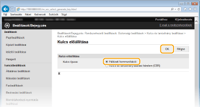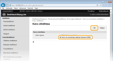 Ha az SSL protokollal folytatott titkosított kommunikációhoz kulcspárra van szükség, akkor az előállítható a készülékkel. Az SSL protokollt a készülék Távoli felhasználói felületen keresztüli elérésekor használhatja. A készülékre legfeljebb négy kulcspár jegyezhető be. Az önaláírt tanúsítványok a „Hálózati kommunikáció” típussal létrehozott kulcspárokkal használhatók. A „Kulcs és tanúsítvány aláírási kérelem (CSR)” esetében a készüléken létrehozott kulcspárhoz kérhet hitelesítésszolgáltató által kiállított digitális tanúsítványt.