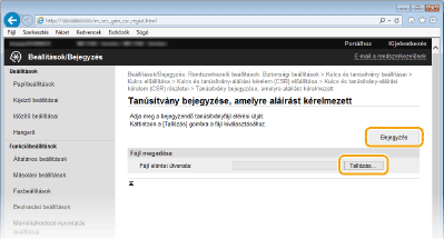 Kattintson a [Browse] (Tallózás) elemre, adja meg a fájlt a tanúsítvány-aláírási kérelemhez, majd kattintson a [Bejegyzés] gombra.