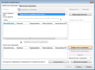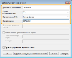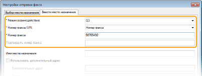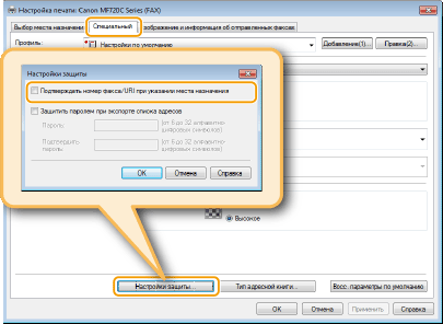 При выборе [Подтверждать номер факса/URI при указании места назначения] в диалоговом окне, всплывающем при нажатии [Настройки защиты] на вкладке [Специальный], также необходимо ввести номер в [Подтвердить номер факса] или [Подтвердить URI]. Для просмотра дополнительных сведений нажмите [Справка] на экране драйвера факса.