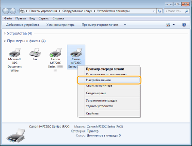 Щелкните правой кнопкой мыши значок драйвера факса для своего устройства и выберите пункт [Настройки печати].