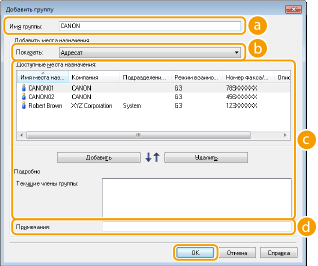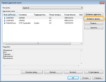 В этом разделе описывается регистрация адресатов в адресной книге для факсов, отправляемых с компьютера. Можно выбрать отдельных адресатов из списка адресатов, зарегистрированных в адресной книге, чтобы создать одного группового адресата (групповой набор). Эта функция используется для отправки данных одновременно нескольким адресатам.
