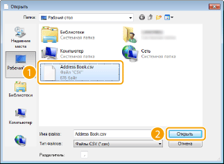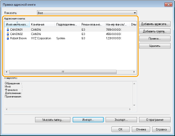 В аппарат можно импортировать адресную книгу в формате CSV, созданную в таких приложениях, как Microsoft Excel, либо экспортировать данные адресной книги в файл, который будет использоваться другими факсимильными аппаратами или приложениями. Устройство поддерживает файлы в двух форматах: CSV-файлы (*.csv) или файлы адресной книги Canon (*.abk).