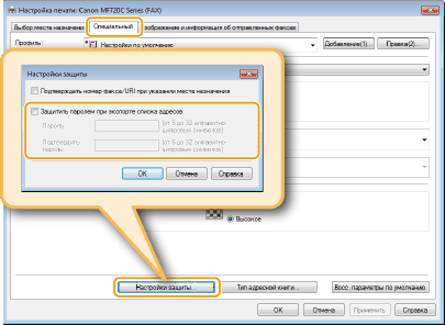 Если в диалоговом окне [Настройки защиты], отображаемом при выборе вкладке [Специальный], установлен флажок [Защитить паролем при экспорте списка адресов], то при нажатии кнопки [Экспорт] отобразится диалоговое окно ввода пароля. Для просмотра дополнительных сведений нажмите [Справка] на экране драйвера факса.