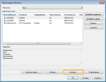 Экспорт данных адресной книги выполняется в указанное расположение.