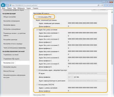 Адреса IPv6 для аппарата можно настроить посредством Remote UI. Перед настройкой адресов IPv6 проверьте настройки адреса IPv4 (Просмотр настроек IPv4). Для использования адресов IPv6 необходимо правильно настроить адреса IPv4. Обратите внимание, что функции сканирования, использующие драйвер сканера или MF Scan Utility (Служебная программа сканирования MF), недоступны в среде IPv6. Аппарат может использовать до девяти следующих адресов IPv6: