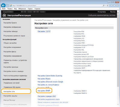 Простой протокол сетевого управления (SNMP) представляет собой протокол для мониторинга и контроля устройств связи в сети с помощью базы данных MIB. Аппарат поддерживает версию протокола SNMPv1 и версию с расширенными функциями безопасности SNMPv3. Статус аппарата можно проверить с помощью компьютера при печати документов или использовать для этого Удаленный ИП. Можно разрешить использование SNMPv1 или SNMPv3 по отдельности или одновременно. Укажите настройки для каждой версии в соответствии с особенностями сетевой среды и конкретными задачами.