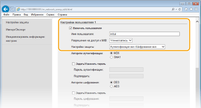 Если включены обе версии SNMP, рекомендуется задать для разрешений SNMPv1 на доступ к объектам MIB значение [Только чтение]. Разрешение на доступ к объектам MIB можно задать отдельно в SNMPv1 и SNMPv3 (а также для каждого из пользователей в SNMPv3). При выборе [Чтение/запись] (разрешение на полный доступ) в SNMPv1 снижает эффективность функций безопасности, которые отличают протокол SNMPv3, поскольку большинство параметров аппарата можно контролировать посредством SNMPv1.