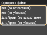 При выборе <Дата/Время (по возрастанию)> или <Дата/Время (по убыванию)> файлы сортируются по дате и времени изменения.