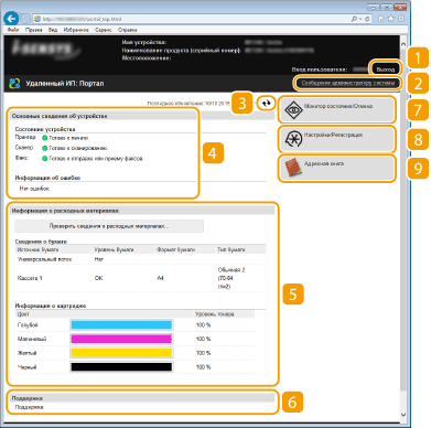 Отображение текущего состояния и информации об ошибках аппарата. Если возникает ошибка, отображается ссылка на страницу сведений об ошибке.