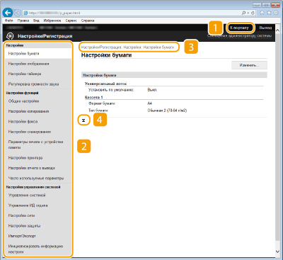 Показывает страницу [Настройки/Регистрация]. При выполнении входа в систему в режиме администратора системы можно изменять параметры и сохранять/загружать зарегистрированные данные.
