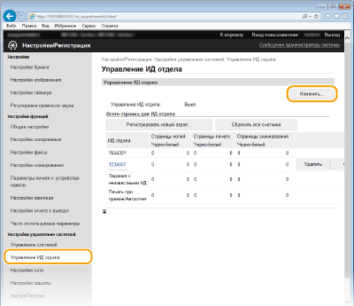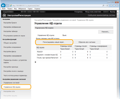 При необходимости обнулить счетчик страниц щелкните ссылку имени подразделения и затем щелкните [ИД отдела] и [Очистить счетчик]