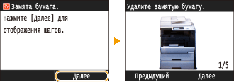 При замятии бумаги на экране отображается сообщение <Замята бумага.>. Коснитесь элемента <Далее>, чтобы просмотреть простые варианты решения проблемы. Если вы не можете понять, какие процедуры следует выполнить, см. следующие разделы для устранения замятия бумаги.