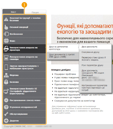 Відображає відомості про те, як переглядати посібник Електронний посібник, шукати в ньому інформацію тощо.