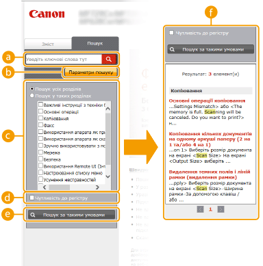 Визначає область пошуку. Звузивши область пошуку, можна ефективно знаходити відповідні теми. Вибір області пошуку особливо корисний, якщо ви уявляєте, де приблизно розміщена потрібна тема.