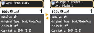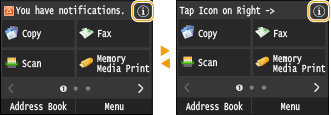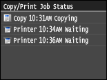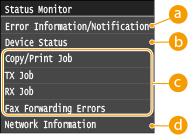 , відкриється екран, на якому можна перевірити стан документів, друк, надсилання чи отримання яких триває. Також можна перевірити стан апарата (залишок тонера в картриджі тощо) та інформацію про параметри мережі, наприклад IP-адреса апарата.