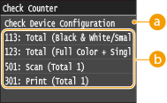 ), відобразиться екран <Check Counter>. За допомогою цього екрана можна переглянути значення лічильників роздруківок, а також серійний номер і конфігурацію апарата.