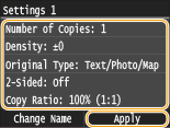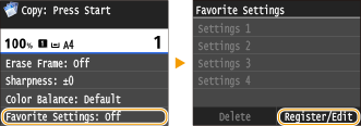 Можна реєструвати до чотирьох часто використовуваних комбінацій параметрів копіювання. За необхідності достатньо вибрати зареєстровану комбінацію параметрів, і таким чином, не потрібно щоразу вводити ті самі параметри для копіювання, наприклад вказувати кількість копій до 5, установлювати для параметра <Erase Frame> значення <On> та збільшувати різкість під час копіювання. Параметри також можна відобразити у вигляді кнопок дії на екрані <Home>.
