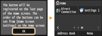 Якщо вибрати пункт <Yes>, з’явиться повідомлення. Перегляньте повідомлення та торкніться кнопки <OK>. Комбінація зареєстрованих параметрів додається до екрану <Home> як кнопка дії.