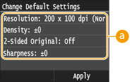<Menu>  <Fax Settings>  <TX Function Settings>  <Change Default Settings>  Торкніться параметра  Змініть значення за промовчанням для вибраного елемента  <Apply>