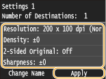 Можна реєструвати до 18 часто використовуваних комбінацій параметрів факсу. За необхідності можна швидко відобразити зареєстровану комбінацію параметрів, і таким чином, не потрібно щоразу вводити ті самі параметри, наприклад вказувати на сканування двостороннього оригіналу документа чи його надсилання 5 адресатам та налаштовувати різкість. Параметри також можна відобразити у вигляді кнопок дії на екрані <Home>.