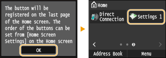 Якщо вибрати пункт <Yes>, з’явиться повідомлення. Перегляньте повідомлення та торкніться кнопки <OK>. Комбінація зареєстрованих параметрів додається до екрану <Home> як кнопка дії.