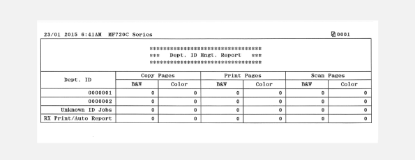 Якщо керування ідентифікаторами відділів активовано, за допомогою друку звіту керування ідентифікаторами відділу можна перевірити загальну кількість роздруківок для кожного значення <Department ID>. Можна ефективніше керувати механізмом подавання паперу й тонера, перевіряючи загальну кількість роздруківок.