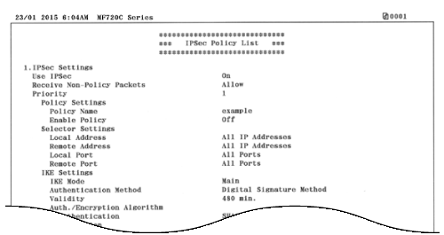 За допомогою друку списку політик IPSec можна перевірити список назв політик і параметри IPSec, зареєстрованих на апараті.