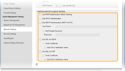 За допомогою Remote UI (Інтерфейс віддаленого користувача) настройте детальні параметри надсилання та отримання, наприклад параметри для використання апарата, щоб надсилати та отримувати інтернет-факси, а також параметри для автентифікації та шифрування POP перед надсиланням повідомлень електронної пошти або інтернет-факсів. Для отримання інформації про необхідні параметри зверніться до свого постачальника або адміністратора мережі.