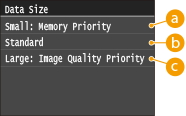 Відскановані документи перетворюються на файли вказаних форматів. На цьому етапі можна вказати рівень стиснення файлу. Параметр <Small: Memory Priority> підвищує коефіцієнт стиснення так, щоб створювати файли з меншим розміром і нижчою якістю зображення. З іншого боку параметр <Large: Image Quality Priority> робить коефіцієнт стиснення нижчим за звичайний, щоб створювати більші файли з підвищеною якістю зображення.