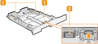 Regulējiet papīra vadotnes atbilstoši ievietotā papīra izmēram, lai nodrošinātu, ka papīrs tiek padots tieši iekārtā. Nospiediet slēdža atbrīvošanas sviras, kas attēlā apzīmētas ar bultiņām, lai atbrīvotu slēdžus un bīdītu papīra vadotnes.