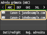 Vairākus adresātus var kombinēt grupās. Vienai grupai varat reģistrēt līdz 299 adresātiem (100 adresātus e-pastiem). Kad grupa ir reģistrēta, varat pievienot vai dzēst adresātus.