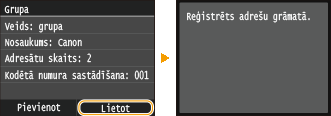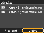 Atkārtojiet 8. un 9. darbību, līdz ir reģistrēti visi vajadzīgie adresāti, un pēc tam pieskarieties <Lietot>.