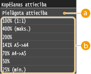 Varat palielināt vai samazināt kopiju izmēru, izmantojot iepriekš iestatītu kopēšanas koeficientu, piemēram, <A5->A4>, vai iestatot pielāgotu kopēšanas koeficientu ar 1% soli.