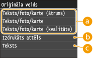 Kopijas optiskā attēla kvalitāti varat izvēlēties atkarībā no dokumenta veida, piemēram, tikai teksta dokumenti, dokumenti ar shēmām un diagrammām vai žurnālu fotoattēli.