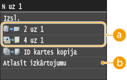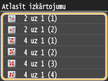 , varat palielināt vai samazināt kopēšanas koeficientu, bet palielinot var netikt nokopētas dokumenta malas.<2 uz 1>/<4 uz 1> nav pieejams, ja izmantojat <Dzēst kontūru> vai <ID kartes kopija>.