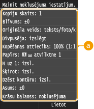 Noklusējuma iestatījumi ir tie iestatījumi, kas tiek parādīti ikreiz, kad ieslēdzat iekārtu vai nospiežat