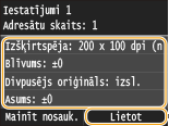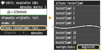 Varat reģistrēt līdz 18 bieži izmantotās faksa iestatījumu kombinācijas. Ja nepieciešams, varat ātri parādīt reģistrētos iestatījumus, tādēļ vairs nav nepieciešams pielāgot iestatījumus katru reizi, piemēram, izpildīt "divpusēja oriģināla skenējuma veidošanu, tā nosūtīšanu 5 adresātiem un asuma iestatīšanu". Iestatījumus varat parādīt arī kā īsinājumpogas ekrānā <Sākums>.