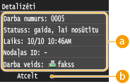 Tiek parādīta detalizēta informācija par sūtāmo dokumentu skaitu, iestatījumiem u.c. Ja vēlaties tikai skatīt detalizētu informāciju bez sūtīšanas, nospiediet