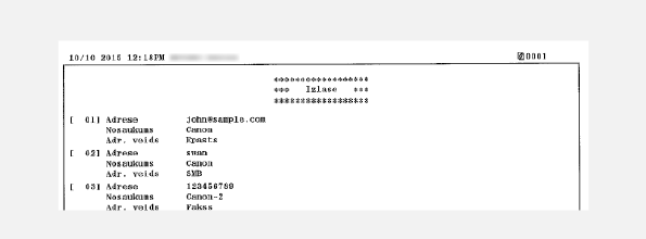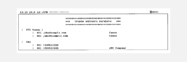 Izdrukājiet adrešu grāmatas sarakstu, lai pārbaudītu tos adresātus, kas adrešu grāmatā ir reģistrēti sadaļā <Kodētā numura sastādīšana>, <Izlase> un <Grupas nr. sast.>.