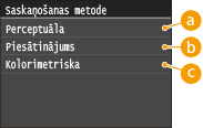 Ja iestatījumam <RGB avota profils> vai <CMYK simulācijas profils> ir atlasīta vērtība <Nav> un iekārta saņem no ierīces atkarīgu krāstelpas definīciju, kurai krāsu apstrādi veic resursdators, iestatījums Saskaņošanas metode netiek lietots.