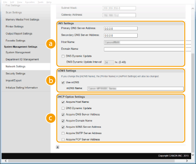 mDNS (multiraides DNS) ir Bonjour pieņemts protokols resursdatora nosaukuma saistīšanai ar IP adresi, neizmantojot DNS. Atzīmējiet izvēles rūtiņu, lai aktivizētu mDNS, un ievadiet mDNS nosaukumu tekstlodziņā [mDNS Name]. [DHCP Option Settings][Acquire Host Name]