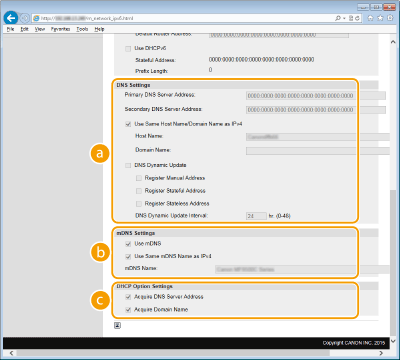 Atzīmējiet šo izvēles rūtiņu, lai izmantotu to pašu mDNS nosaukumu, kas tiek lietots IPv4. Lai iestatītu citu nosaukumu, notīriet šo izvēles rūtiņu un ievadiet mDNS nosaukumu tekstlodziņā [mDNS Name]. [DHCP Option Settings][Acquire DNS Server Address]