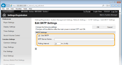 Vienkāršais tīkla laika protokols (Simple Network Time Protocol — SNTP) ļauj pielāgot sistēmas pulksteni, izmantojot tīklā esošu laika serveri. Šo protokolu parasti izmanto iekārtas un servera sinhronizēšanai, piem., ja iekārtai ir jāpiekļūst LDAP serverim ar iespējotu drošības autentifikāciju. Laiks tiek pielāgots pēc universālā koordinētā laika (Coordinated Universal Time — UTC), tāpēc pirms SNTP konfigurēšanas norādiet laika joslas iestatījumu (Datuma/laika iestatījumi). SNTP iestatījumus var norādīt, izmantojot utilītprogrammu Remote UI (Attālais lietotāja interfeiss).