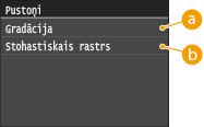 Varat izvēlēties drukāšanas metodi, lai optimālas attēla kvalitātes iegūšanai attēlotu pustoņus (vidējo diapazonu starp attēla gaišākajiem un tumšākajiem laukumiem). Pieskarieties <Gradācija> vai <Stohastiskais rastrs>.